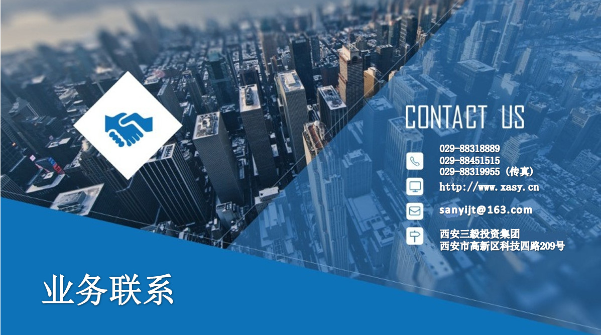 公司名稱:西安三毅投資集團 公司地址:西安市高新技術開發(fā)產(chǎn)業(yè)區(qū)科技四路209號 郵政編碼:710065 公司電話:029-88318889 029-88451515